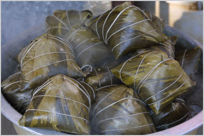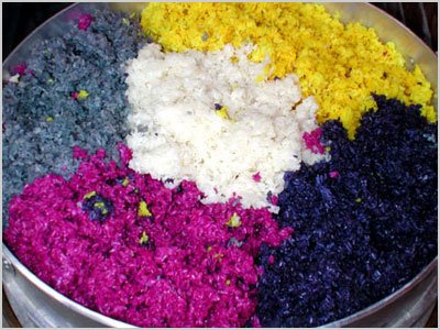 壮族的主食以大米为主,次为玉米、芋头及黑饭豆、白饭豆和绿豆等。壮族的豆饭、肉末粥、竹节焖饭都芳香可口,别有风味。壮族的节日食品显示出浓郁的民族特色,如色香味俱佳的五色饭、糍粑、油堆和沙糕;有外形奇特的各色粽子,吃法与众不同的包生饭,金灿灿的粘小米饭,以及无论节日或平时都受欢迎的米粉。每年三月初三歌节,家家都做五色饭,吃五色蛋。