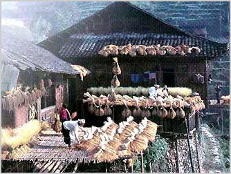 壮族住房最具特色的是“干栏”式房子,称为干栏建筑。它可分为全楼居式,半楼居式,地居式等几类。一般都分上下两层及阁楼等三部分。上层住人,多数为三开间,也有五开间和七开间的,进门是厅堂,厅后是火塘间,用作煮饭和取暖。楼阁在上层,多用于存放粮食。