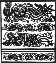 (1)中心式:这种构图用于整幅的袖腰剪纸,一般以一大形动物居画面中心占大部面积,动物上常配以人物。出现的动物有象、狮、虎、龙牛、龙、马。四周以蝶、鱼、鸟、鼠、兔、鹿等为小纹样相配。