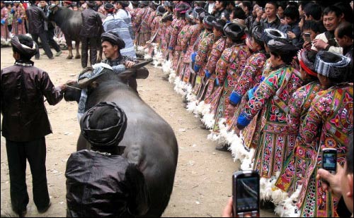 在杀牛祭祖时,场面更为惊心动魄,时间选在深夜凌晨三点,此时周围人山人海,火把通明,杀牛地方采用两棵粗大的木桩捆在一起,形成X字形,两端深埋地下,只见牛被一大群人簇拥推拉着,将牛头架在X字形上面,随即由牛主人姑表之类亲戚,手持斧头,在牛头部猛击数斧,牛毫无反抗力一声不吭立即死去,尔后主人急忙将牛舌头拉出、将预先准备好削尖的细木插入舌头中间,其说法是牛死后到了阴间,阎王爷问其是怎样死的,它没有舌头后,说不清楚阳间发生的一切事。