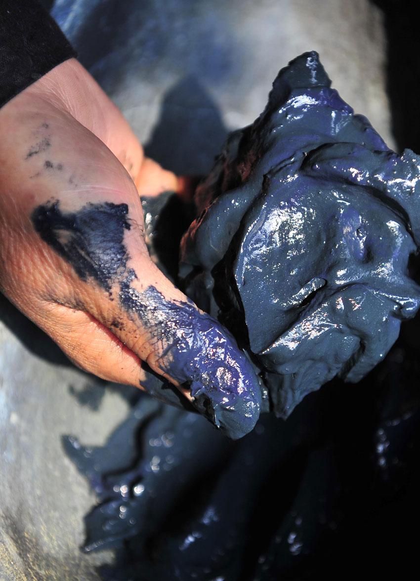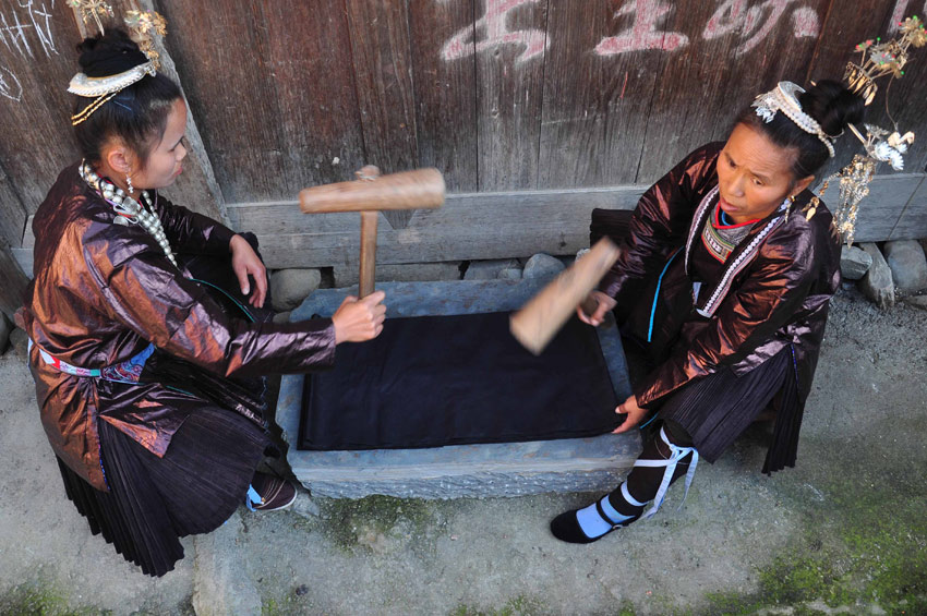侗族村寨的妇女要先将收获的棉花纺成纱线再织成土布,用一种叫靛蓝草叶的植物反复浸染把布料染成深蓝色,然后将上色的布料放到盛满鸡蛋清的钵体内浸泡数日,使蛋清充分渗透布料表里面,在避风处风干后放在平整的石头上,用木锤上万次捶打去皱,直到布料透亮平直,最后才可以缝制。相对于男装而言,女装要在衣服的袖口、对襟等多个部位手工绣上各种漂亮的图案,装点上银饰,制作过程复杂很多。刺绣的过程快的要几个月,慢的要一年之久才能完工。由于制作过程漫长而艰辛,侗族服装也倍显珍贵。它不仅凝聚了侗家人的心血,更是侗族民族精华的完美体现。