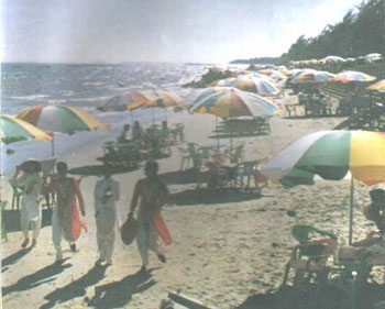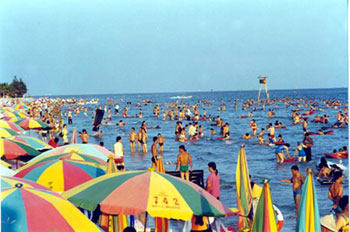 银滩周围环境幽美。植树林荫,草地茵绿,中西建筑争妍比美,亭台楼阁别有情趣。五颜六色的太阳伞象朵朵鲜花点缀滩上,使人大有“翠色锦屏秀,碧玉水中照” 之感。