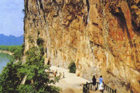 花山位于广西明江左岸,距宁明县城 5O里。花山崖壁画是左江崖壁画的代表作,高距地面250米,山势陡峭,壁画就在临江的崖壁上,向西南方。画面高44米,宽170米,是我国现存最大的一幅崖壁画。画面从距山脚2米开始绘制,而以5-20米高的中间部分的画像最多。崖画大部分描绘着不同的人物形态,至今仍能清晰可辨的约有 1300多个,最大的高达2米,最小的不到O.3米,多数人物在0.6至1.5米之间。人物旁边、顶部或脚下多配有物件或动物,共同构成花山的全部壁画。所绘人物均为裸体,形象淳朴,形态各异。正中有一个腰挂刀剑、头上有兽形装饰,配有坐骑的数米高巨人,威风凛凛地站在那里观看弄鼓击乐狂歌纵舞的人群,估计为领袖或指挥官。其余人物多取正面,双臂平伸上举,腿曲作骑马蹲档式,好似舞蹈动作的-瞬间;也有少数侧面人物,多数难辨性别。纵观全面,画面表现的是某种祭祀活动的场面,但具体内容所指,目前有不同的看法。花山崖画系用软刷类工具调红颜色画成,用笔粗犷有力,古朴稚拙,群像生动,构图饱满,求密讲势。画壁于河弯处的峡谷陡崖之上,在阳光照耀和水光反映下,放出红色异彩,大气神秘。崖画无文字说明,关于制作时间,说法不一。有的认为是我国战国前期,有的认为是汉代遗物,有的认为是唐宋西原蛮人遗物。虽然断代有不同看法,但多数学者认为花山崖画距今已有1000-2000年的历史,是壮族先民骆越人留下的艺术作品。