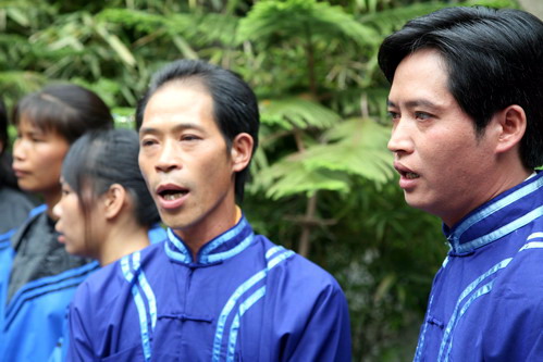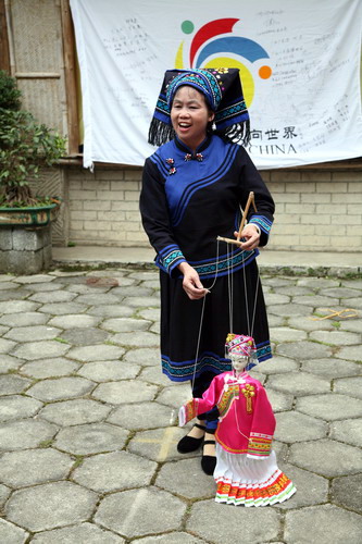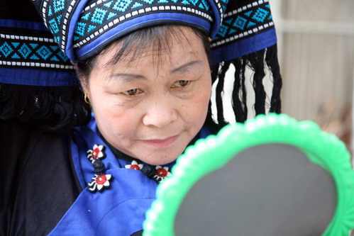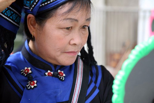 在靖西县,壮族占总人口的99.4%,是我国壮族人口比例最高的县,是典型的壮乡,生态盎然。靖西壮族传统的服饰以蓝、黑为主色调。以前最常见的一般服饰是上白(带有长穗的白等浅色的头巾),中蓝(镶黑边的蓝大卦),下黑(宽裤脚的长裤)。