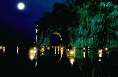 《桂林山水的传说》里有一篇犀牛望月的故事,如果我没有记错的话,也许是讲的这里吧。提起犀牛望月,我总是喜欢想像,每当皓月当空,会有灵犀分开这水面凝望。上古时,嫦娥服下了西王母的不死之药离开了后翌,后翌是否也这样凝望过那窈窕飘荡奔月而去的身影,是否也这样凝望过那渺渺月宫?