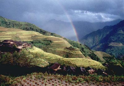 龙胜县的梯田别称“龙脊梯田”,独具特色。我的老家在越城岭的大山里,就在当年红军长征经过的老山界不远的地方,也是这样的景象。木屋建在山顶上,用劈开的竹子从更高的山上引来甘冽的泉水……在都市里住得久了,彩虹在我的印象中竟然也已经成了久远的回忆。这十余年来我们身边的环境在无声无息中发生了剧烈的变化,四季不再分明,天空不再澄澈,我甚至已经不记得上一次看见真的彩虹是在什么时候了。