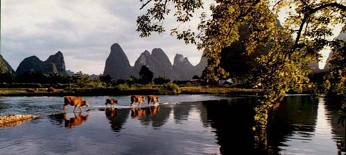 要说桂林山水的来历,照那本再版了不知多少次的《桂林山水的传说》里的说法,还和秦始皇有关。始皇帝一统天下,因海疆属龙王所管,怒而赶山填海。群山被驱赶到桂林的时候,始皇中了龙王的计策,失掉了赶山鞭,于是形态各异的群山就这样留在了桂林,造就了这片山水佳地。