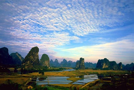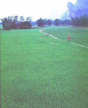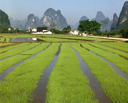 桂林境内的农作物绝大部分是水稻,农人会在水稻田里放养群群鲤鱼,它们一来可以吃掉田里的害虫,二来长成之后就是有名的桂北禾花鱼,和上山中酸笋和辣椒,就是桂林人桌上一道佳肴了。