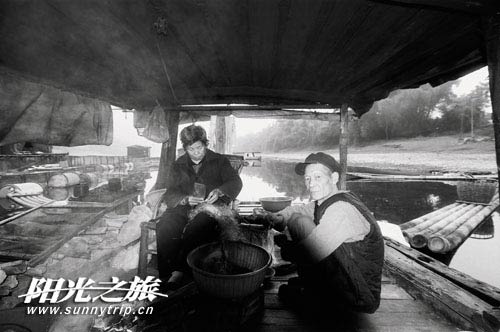 我问船家莫得贵,想上岸居住吗?他说,当然想呢!人往高处走,水往低处流,人之常情。住在船上,连腰都直不起,冬天寒风阵阵吹,夏天闷热潮湿,蚊虫也特多,特别是天将黑时,黑鸦鸦的一大片,随手抓一大把的。可是岸上没有我们渔民的土地,怎么盖房子?1977年,随着漓江旅游业的兴起,因渔民拉纤运货行船太落后,也搞过陆上定居。可是每家才30平方米的定居面积,135元/人的上岸费,根本解决不了问题。我们渔民家庭人口多,不够住,只好又回到船上。