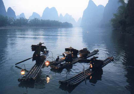 漓江,江水清澈,游鱼可数,是以叼鱼为食的鸬鹚鸟的天堂,也是阳朔漓江渔民用驯化的鸬鹚捕鱼的一种特殊劳作方式。鸬鹚捕鱼,以晚上作业最为壮观。您看,在那月光朦胧的夜色里,江面上渔灯往来穿梭,鸬鹚鸟扑腾欢闹,又加上渔歌唱晚,编织成一幅漓江渔火图,真是美不胜收。